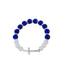 This refined bracelet combines deep indigo blue and luminous opal white pearls for an elegant and harmonious contrast. It is enhanced by a cross delicately adorned with sparkling zircons, adding a touch of brilliance and spirituality.