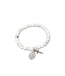 Le bracelet en howlite à grains monté sur un élastique, orné d'une croix et d'une médaille de la Miraculeuse, est un bijou élégant et précieux, contenant des symboles religieux puissants.