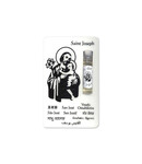 Jolie carte de prière avec une capsule d'huile de saint Joseph ® et une belle représentation de saint Joseph. Le mot saint Joseph y est décliné en 10 langues :